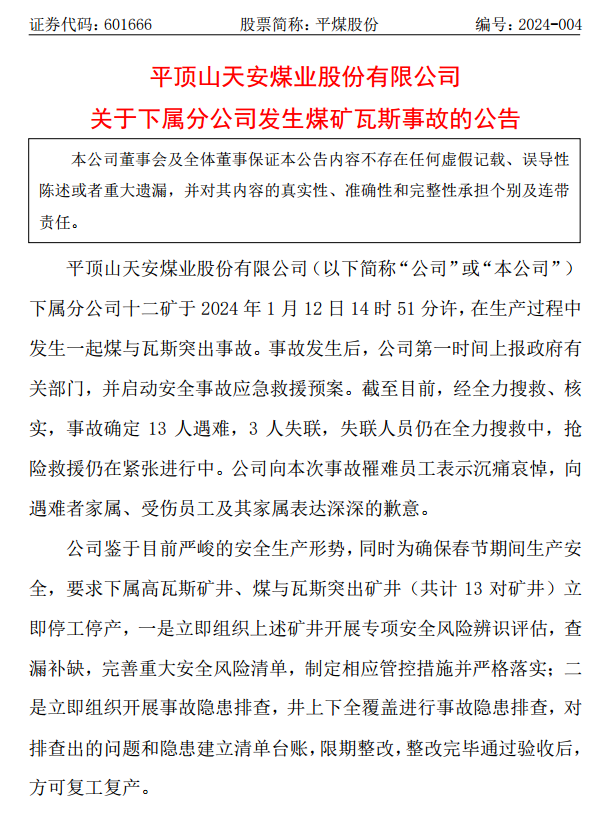 1月14日訊,平煤股份公告,下屬分公司十二礦于1月12日14時(shí)51分許,在生產(chǎn)過程中發(fā)生一起煤與瓦斯突出事故。截至目前,經(jīng)全力搜救、核實(shí),事故確定13人遇難,3人失聯(lián),失聯(lián)人員仍在全力搜救中,搶險(xiǎn)救援仍在緊張進(jìn)行中。