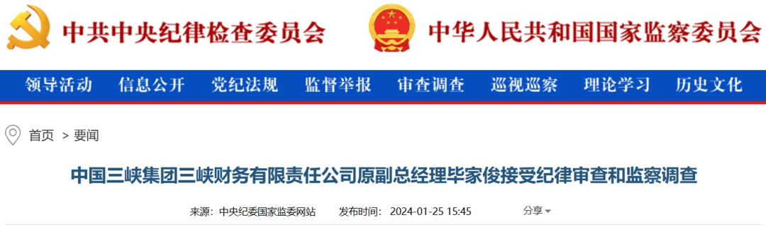 中央紀(jì)委國家監(jiān)委網(wǎng)站1月25日消息,據(jù)中國三峽集團(tuán)紀(jì)檢監(jiān)察組、湖北省紀(jì)委監(jiān)委消息:中國三峽集團(tuán)三峽財務(wù)有限責(zé)任公司原副總經(jīng)理畢家俊涉嫌嚴(yán)重違紀(jì)違法,目前正接受中國三峽集團(tuán)紀(jì)檢監(jiān)察組和湖北省天門市監(jiān)委紀(jì)律審查和監(jiān)察調(diào)查。