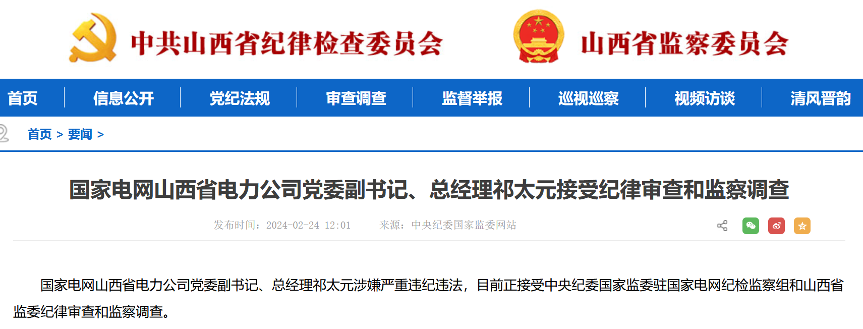 據(jù)中央紀委國家監(jiān)委網(wǎng)站消息,國家電網(wǎng)山西省電力公司黨委副書記、總經(jīng)理祁太元涉嫌嚴重違紀違法,目前正接受中央紀委國家監(jiān)委駐國家電網(wǎng)紀檢監(jiān)察組和山西省監(jiān)委紀律審查和監(jiān)察調(diào)查。