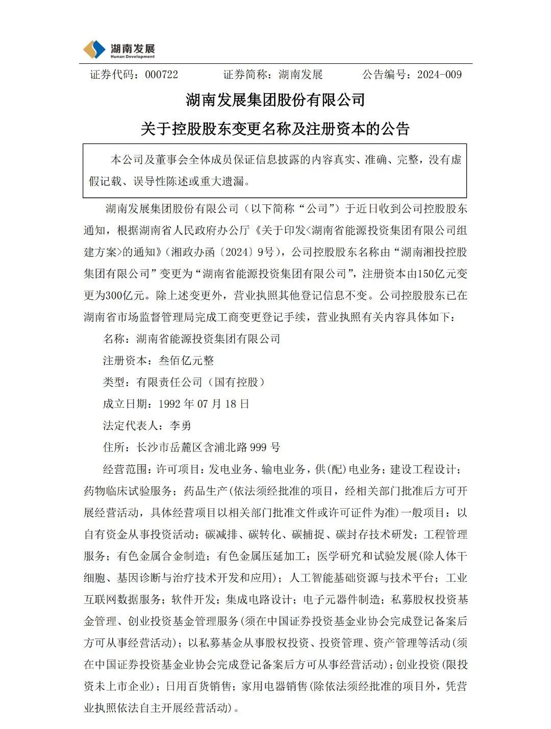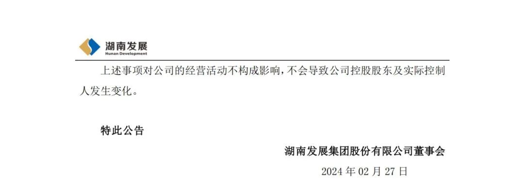 2月27日,湖南發(fā)展集團股份有限公司發(fā)布關于控股股東變更名稱及注冊資本的公告,公告顯示:湖南發(fā)展集團股份有限公司于近日收到公司控股股東通知,根據(jù)湖南省人民政府辦公廳《關于印發(fā)<湖南省能源投資集團有限公司組建方案>的通知》(湘政辦函〔2024〕9號),公司控股股東名稱由“湖南湘投控股集團有限公司”變更為“湖南省能源投資集團有限公司”,注冊資本由150億元變更為300億元。除上述變更外,營業(yè)執(zhí)照其他登記信息不變。公司控股股東已在湖南省市場監(jiān)督管理局完成工商變更登記手續(xù)。