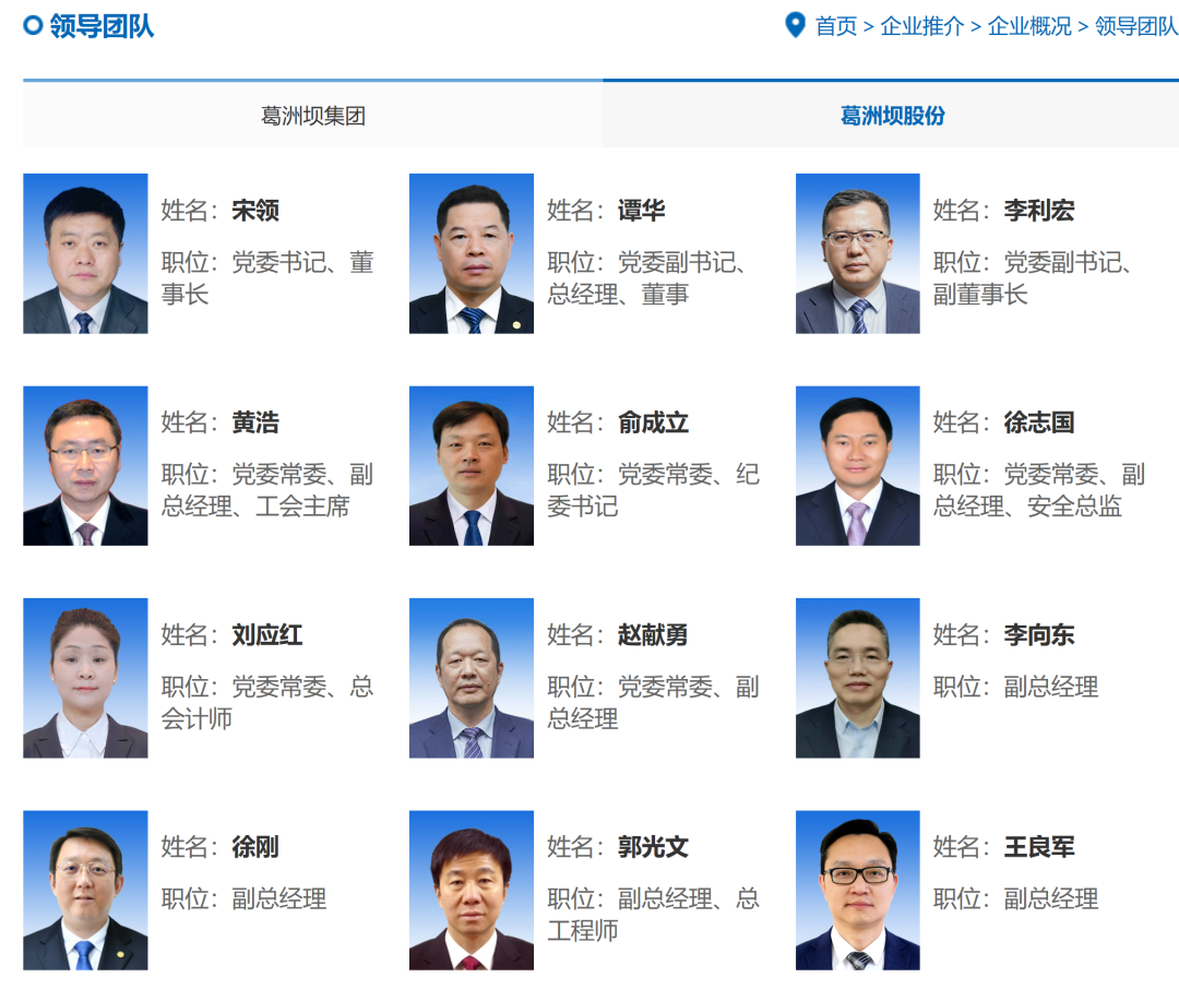 截至3月6日,中國葛洲壩集團官網(wǎng)領(lǐng)導(dǎo)團隊專欄顯示,葛洲壩集團領(lǐng)導(dǎo)如下: