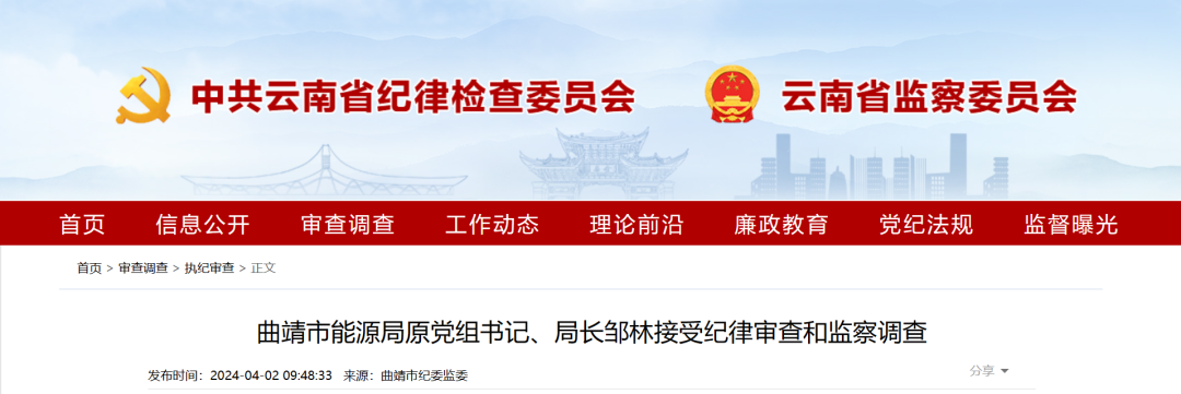 據(jù)曲靖市紀委監(jiān)委消息:曲靖市能源局原黨組書記、局長鄒林涉嫌嚴重違紀違法,主動投案,目前正接受曲靖市紀委監(jiān)委紀律審查和監(jiān)察調(diào)查。