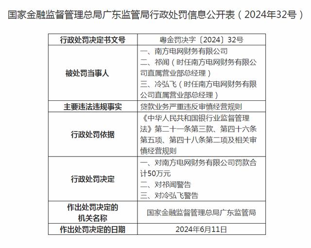 臺海網(wǎng)6月19日訊 根據(jù)國家金融監(jiān)督管理總局網(wǎng)站近日發(fā)布的行政處罰信息公開表(粵金罰決字〔2024〕32號)顯示,因貸款業(yè)務(wù)嚴(yán)重違反審慎經(jīng)營規(guī)則,國家金融監(jiān)督管理總局廣東監(jiān)管局對南方電網(wǎng)財(cái)務(wù)有限公司罰款合計(jì)50萬元。