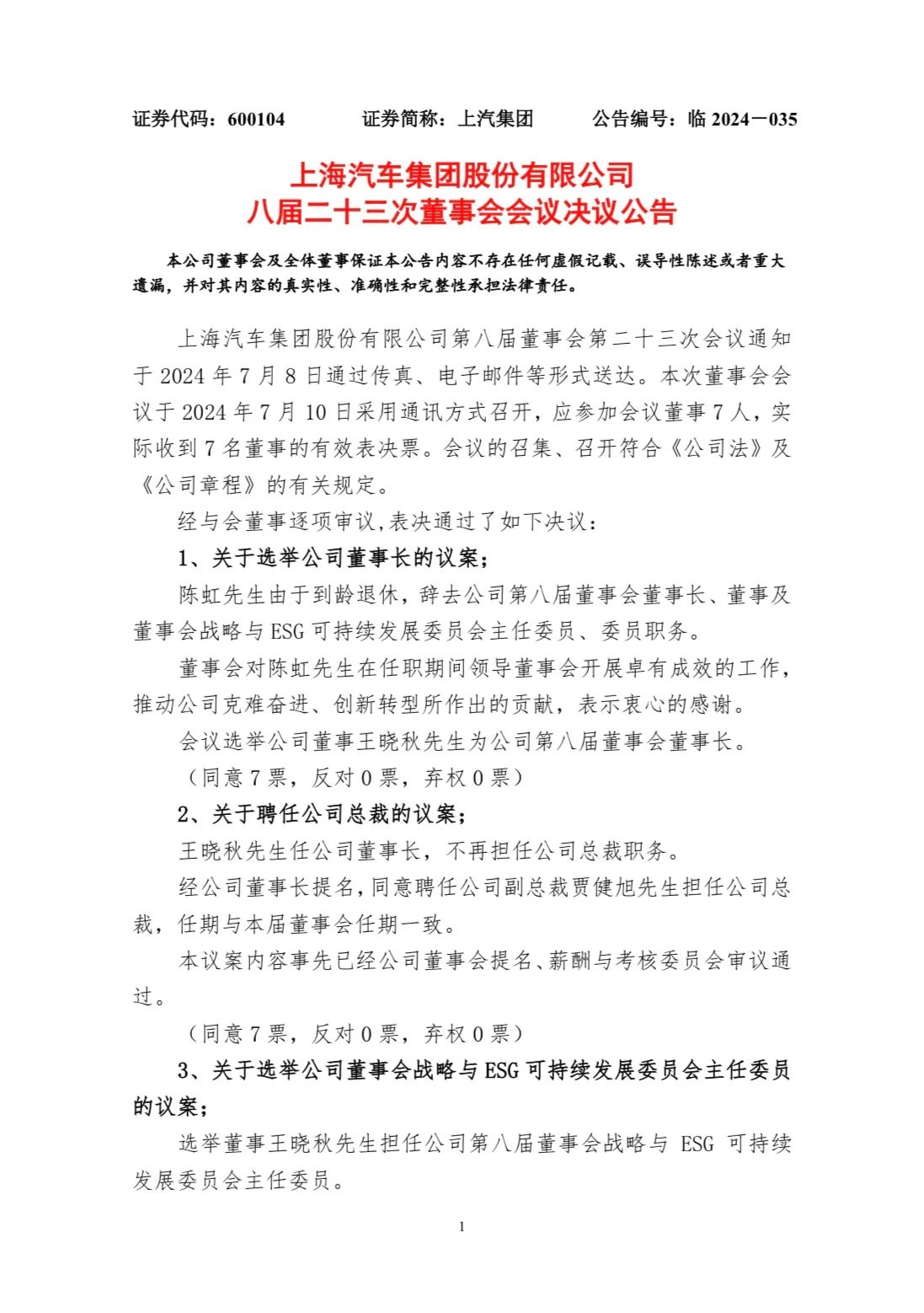 上海汽車集團股份有限公司(以下簡稱“上汽集團”)董事長陳虹因到齡退休辭去公司第八屆董事會董事長、董事及董事會戰(zhàn)略與ESG可持續(xù)發(fā)展委員會主任委員、委員職務(wù);王曉秋任第八屆董事會董事長。