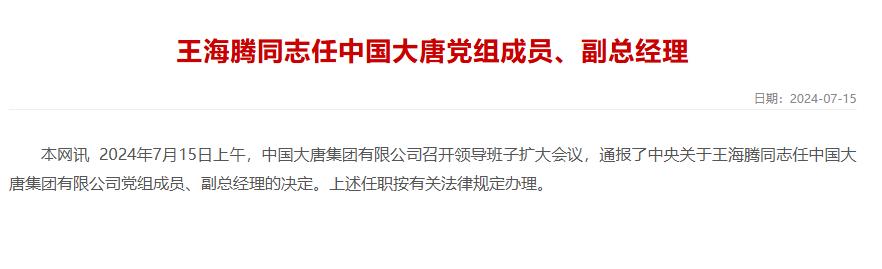 據(jù)大唐集團(tuán)官網(wǎng)消息,2024年7月15日上午,中國(guó)大唐集團(tuán)有限公司召開(kāi)領(lǐng)導(dǎo)班子擴(kuò)大會(huì)議,通報(bào)了中央關(guān)于王海騰同志任中國(guó)大唐集團(tuán)有限公司黨組成員、副總經(jīng)理的決定。上述任職按有關(guān)法律規(guī)定辦理。