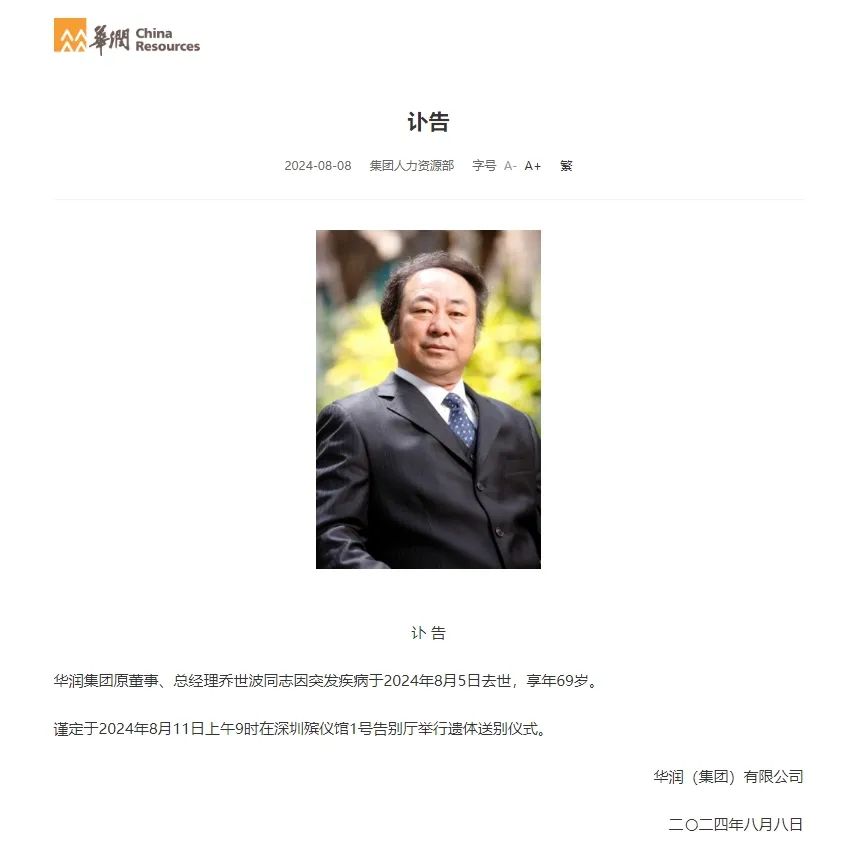 2024年8月5日,華潤集團(tuán)原董事、總經(jīng)理喬世波因突發(fā)疾病去世,享年69歲。其遺體送別儀式定于8月11日上午9時(shí)在深圳殯儀館1號告別廳舉行。