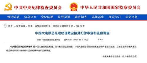 8月11日,中央紀(jì)委國家監(jiān)委網(wǎng)站發(fā)布消息,據(jù)中國大唐紀(jì)檢監(jiān)察組、四川省紀(jì)委監(jiān)委消息,中國大唐原總經(jīng)理助理戴波涉嫌嚴(yán)重違紀(jì)違法,目前正接受中國大唐紀(jì)檢監(jiān)察組和四川省成都市監(jiān)委紀(jì)律審查和監(jiān)察調(diào)查。