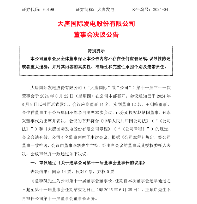 8月23日,大唐發(fā)電公告稱,董事會審議通過《關(guān)于選舉公司第十一屆董事會董事長的議案》,同意李凱先生為公司第十一屆董事會董事長,任期自本次董事會選舉通過之 日起至第十一屆董事會任期結(jié)束之日止(即2025年6月28日)。王順啟先生不再擔(dān)任公司第十一屆董事會董事長職務(wù)。
