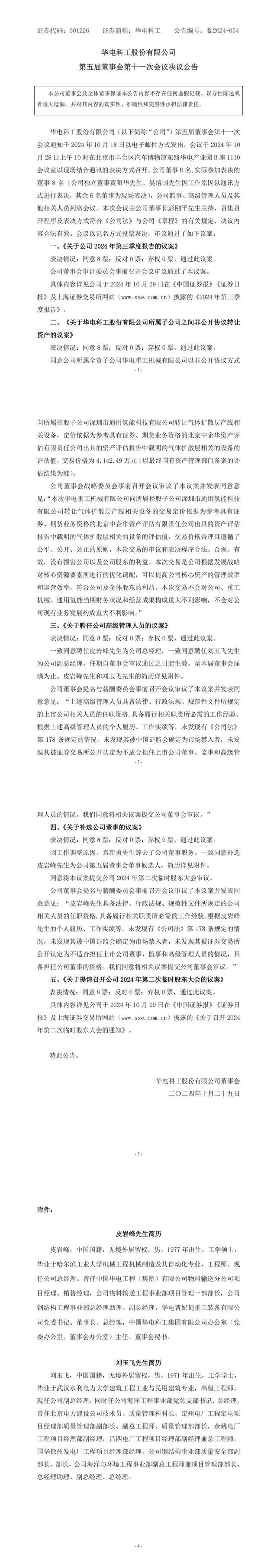 10月29日,華電科工發(fā)布公告,公司召開第五屆董事會第十一次會議,一致同意聘任皮巖峰先生為公司總經(jīng)理,一致同意聘任劉玉飛先生為公司副總經(jīng)理,任期自董事會審議通過之日起生效,至本屆董事會屆滿為止。因工作調(diào)整原因,袁新勇先生辭去公司董事職務。一致同意補選皮巖峰先生為公司第五屆董事會董事候選人。
