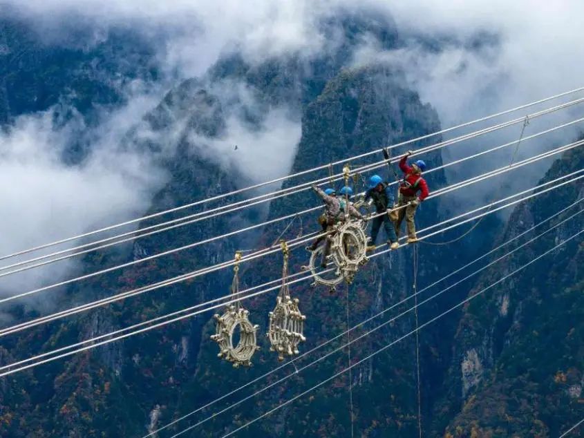 國(guó)網(wǎng)四川電力施工人員開展川渝特高壓工程輸電線路間隔棒安裝作業(yè)