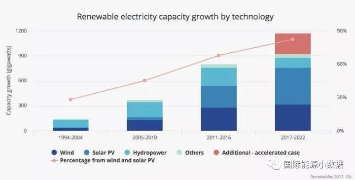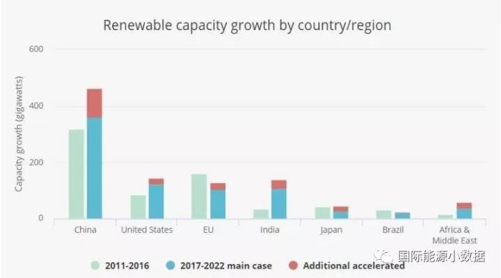 過去對于可再生能源發(fā)展規(guī)模預測曾經偏保守的IEA現在預測,2017-2022年間全球可再生能源新增裝機將至少達到920吉瓦(其中風電321吉瓦、光伏438吉瓦),其中363吉瓦(39%)將來自中國。如果各國政策支持力度加大的樂觀情形下,2017-2022年間可再生能源新增裝機可能達到1150吉瓦,其中464吉瓦(40%)來自中國。