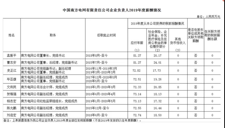 中國電力網(wǎng)(微信公眾號:China_Power_com_cn)獲悉,近日,國家電網(wǎng)、南方電網(wǎng)、華能集團、國家能源集團、中廣核、中國能建、中國電建等能源電力央企發(fā)布了企業(yè)負責人2019年度薪酬情況。