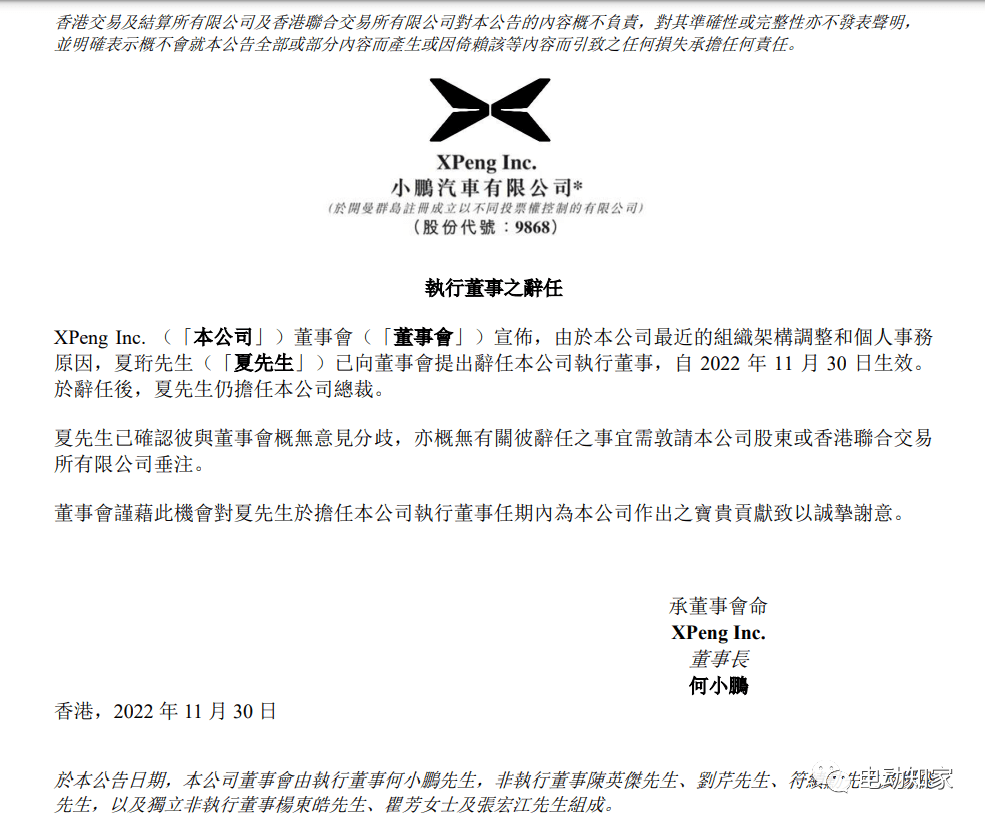 不久前,夏珩更是接連卸任廣東小鵬汽車科技有限公司、廣州小鵬汽車科技有限公司職務,并均由何小鵬接任。2022年11月30日,小鵬汽車發(fā)布公告稱,因公司組織架構(gòu)調(diào)整及個人事務原因,小鵬汽車聯(lián)合創(chuàng)始人、總裁夏珩將辭去公司董事會執(zhí)行董事職務,11月30日生效。辭任執(zhí)行董事后,夏珩仍將擔任小鵬汽車總裁一職。