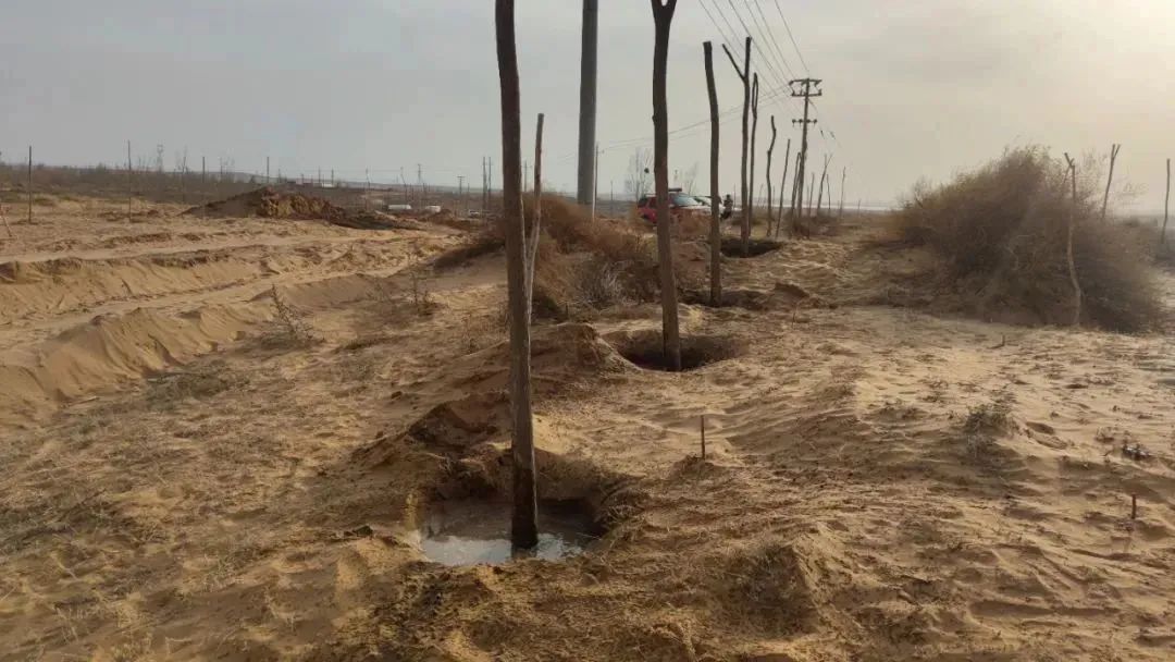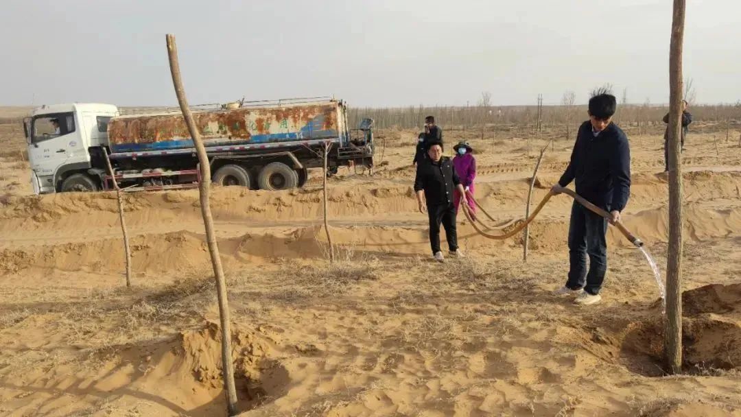 (靈武市自然資源局專業(yè)技術人員指導苗木保護,馬家灘鎮(zhèn)工作人員對苗木進行澆灌)