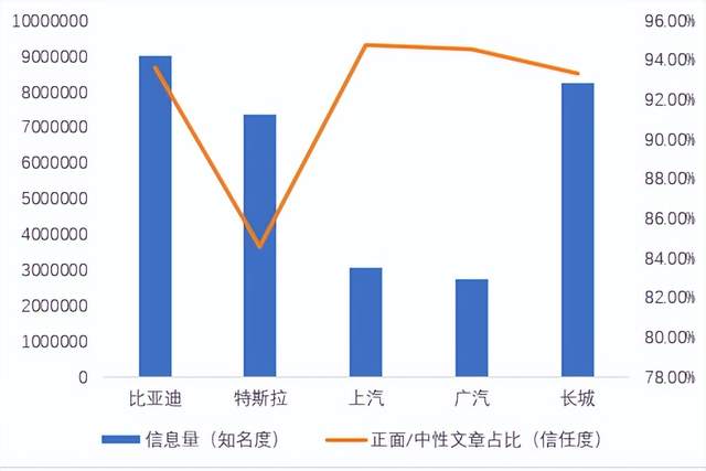 根據(jù)人民數(shù)據(jù)資產(chǎn)服務(wù)平臺數(shù)據(jù)顯示,截至2023年9月底,比亞迪、特斯拉、上汽、廣汽、長城的總信息量(知名度)和正面/中性文章占比(信任度)呈現(xiàn)出一定的特點(diǎn)。