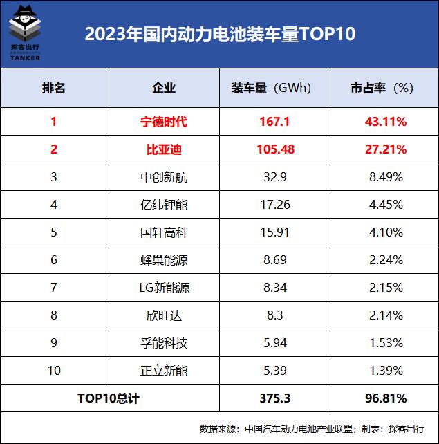 「探客出行」從中國汽車動(dòng)力電池產(chǎn)業(yè)聯(lián)盟獲悉,2023年國內(nèi)動(dòng)力電池裝車量TOP10企業(yè)累計(jì)裝車量約375.3GWh,占據(jù)國內(nèi)動(dòng)力電池總裝機(jī)量的96.81%。其中寧德時(shí)代,比亞迪以絕對(duì)優(yōu)勢穩(wěn)居前二,累計(jì)市場占有率超七成。