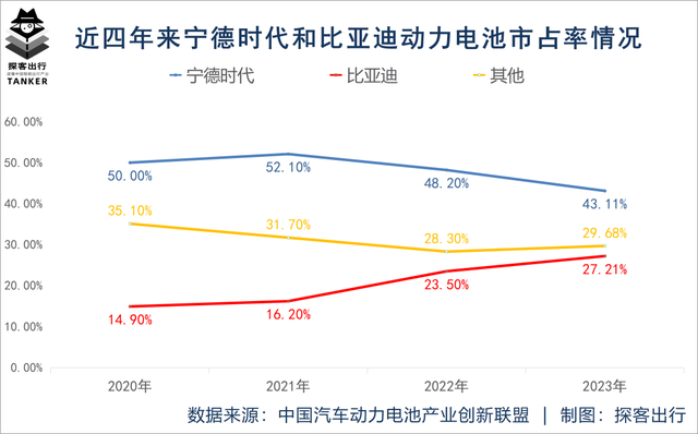 雖說,寧德時(shí)代在2023年國內(nèi)動(dòng)力電池市場的市占率位居全行業(yè)第一,高達(dá)43.11%,但相比于2021年高達(dá)52.10%的市占率,已經(jīng)出現(xiàn)了明顯下滑。