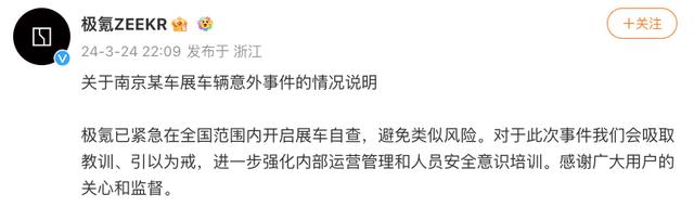 針對此次意外事件,極氪官方微博@極氪ZEEKR 于3月24日22時09分發(fā)布《關(guān)于南京某車展車輛意外事件的情況說明》。
