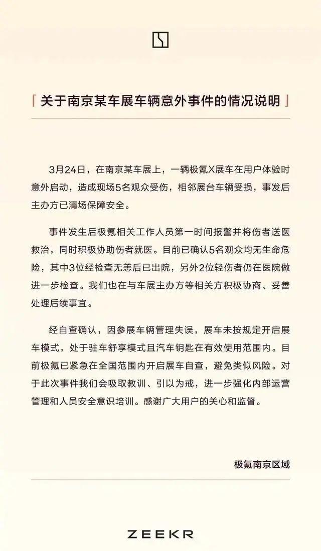 3月24日,在南京某車展上,一輛極氪X展車在用戶體驗時意外啟動,造成現(xiàn)場5名觀眾受傷,相鄰展臺車輛受損,事發(fā)后主辦方已清場保障安全。