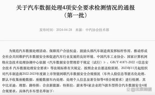 4月28日,中汽協(xié)官方發(fā)布《關(guān)于汽車數(shù)據(jù)處理4項安全要求檢測情況的通報(第一批)》,其中,比亞迪、理想、路特斯、合眾新能源(哪吒汽車)、特斯拉、蔚來6家企業(yè)的76款車型符合汽車數(shù)據(jù)安全4項合規(guī)要求。