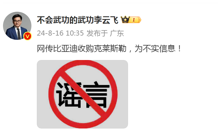 近日,有消息稱,比亞迪正推進(jìn)收購克萊斯勒。8月16日,比亞迪品牌與公關(guān)事業(yè)部總經(jīng)理李云飛在其個人微博上回應(yīng)稱上述消息不實。同日,比亞迪有關(guān)人士回應(yīng)媒體表示,公司對于收購克萊斯勒傳聞的態(tài)度與李云飛微博內(nèi)容一致。