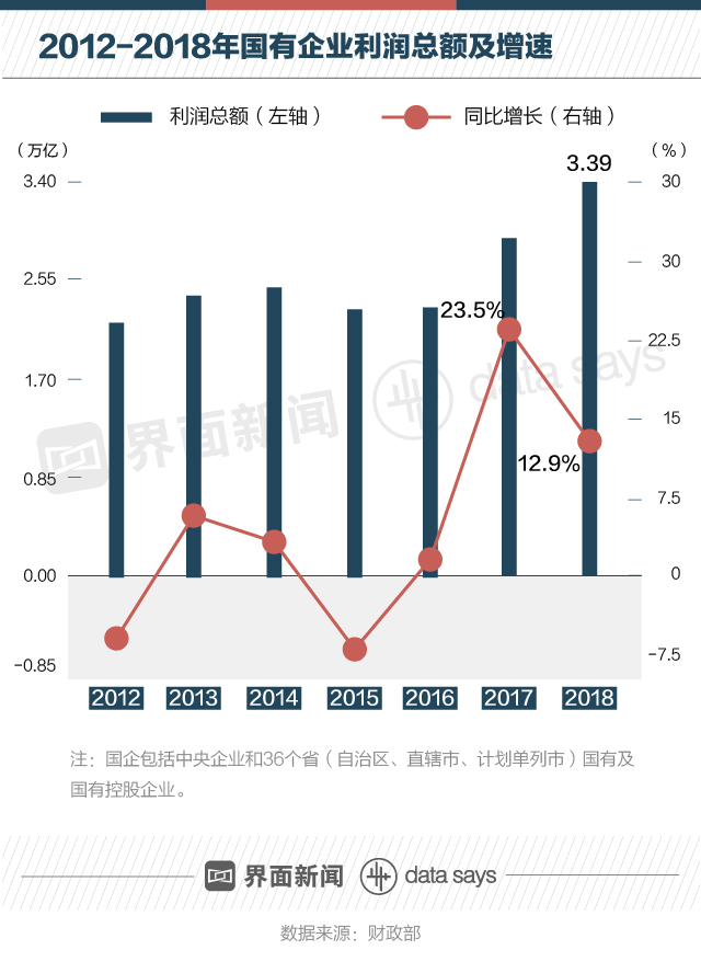 財政部數(shù)據(jù)顯示,2012年以來,國有企業(yè)利潤額總體保持增長勢頭。2015年國企利潤總額小幅下跌后,在2016年開始回升,并在2017年實現(xiàn)大幅反彈。2018年國企利潤總額達3.39萬億,創(chuàng)歷史新高。