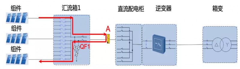 如上圖的A點(diǎn)發(fā)生短路故障,紅色故障回路:QF1為匯流箱斷路器,額定電流500A,由于組件的短路電流在480A左右,QF1一直不會(huì)脫扣,持續(xù)輸出直流能量到故障點(diǎn),維持電弧燃燒,擴(kuò)大火災(zāi)事故。