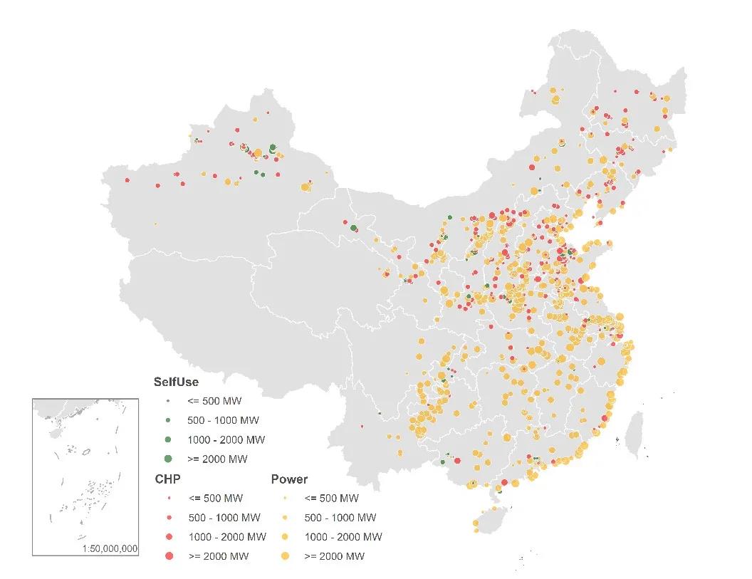 圖1 中國現(xiàn)役燃煤電廠的分布,應(yīng)用領(lǐng)域及裝機(jī)容量