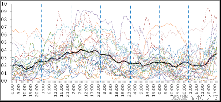 如下圖所示,單一省份(圖中彩色線條)的風(fēng)電出力在不同時段波動較大,但當(dāng)在更大地理范圍做耦合,比如放眼“三北”及華中華東區(qū)域,整體風(fēng)電出力曲線實現(xiàn)平滑,新能源可以得到更好的消納。