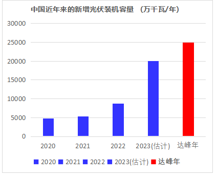 按上表的計(jì)算結(jié)果,如果風(fēng)電、水電和核電未來每年的新增裝機(jī)容量以2022年的新增裝機(jī)容量作為基準(zhǔn)基本不變,每年新增的能源需求量不變,保守估計(jì)中國每年的新增光伏裝機(jī)容量在2023年2億千瓦新增容量的基礎(chǔ)上再增加約5000萬千瓦,達(dá)到2.5億千瓦/年左右,就會(huì)實(shí)現(xiàn)碳達(dá)峰。