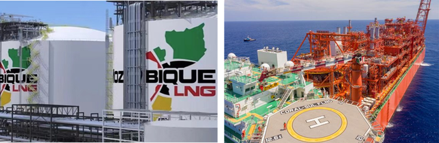 停產(chǎn)的莫桑比克LNG陸地工廠項(xiàng)目(左圖)與成功投產(chǎn)的莫桑比克FLNG項(xiàng)目(右圖)
