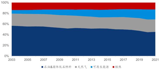 以歐美地區(qū)為代表,天然氣已經(jīng)成為眾多歐美國(guó)家的重要支柱能源。在歐盟27國(guó)中,天然氣作為直接燃料或發(fā)電能源,提供了該地區(qū)45%的化工能源需求、40%的鋼鐵能源需求、55%的食品飲料能源需求和40%的建筑能源需求。歐洲在過去二十年致力于推動(dòng)清潔能源的利用,將可再生能源的占比從7%提升至了19%,但主要取代的是煤炭和石油的份額,絲毫沒有動(dòng)搖天然氣在歐洲地區(qū)的重要地位,天然氣在所有能源中穩(wěn)定占據(jù)約23%的份額。
