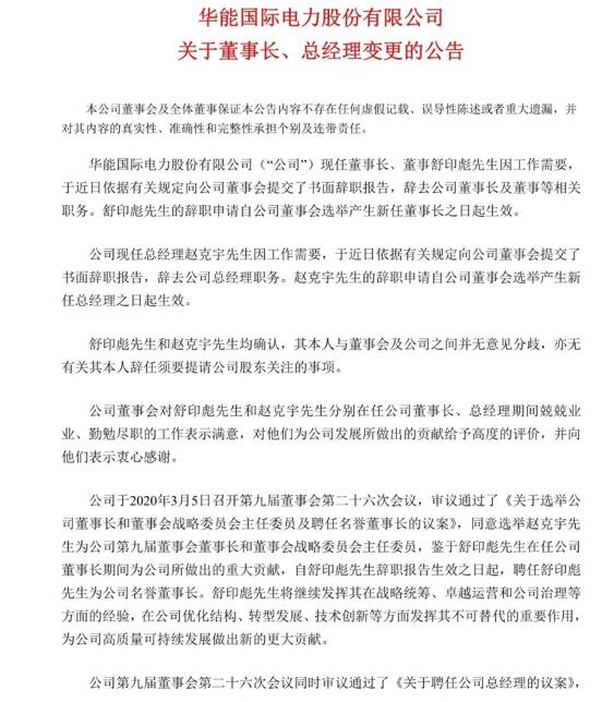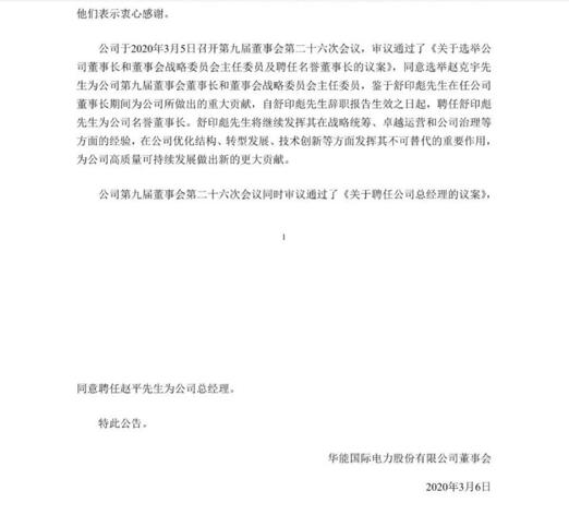 中國(guó)電力網(wǎng)訊 3月5日,華能國(guó)際電力股份有限公司發(fā)布公告,因工作需要,現(xiàn)任董事長(zhǎng)、董事舒印彪和現(xiàn)任總經(jīng)理趙克宇于近日提交書(shū)面辭職報(bào)告,辭去相關(guān)職務(wù)。當(dāng)日,公司董事會(huì)同意選舉趙克宇為公司第九屆董事會(huì)董事長(zhǎng)和董事會(huì)戰(zhàn)略委員會(huì)主任委員。