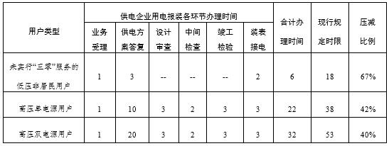 ——辦電更省時(shí)。2020年底前,電力接入工程項(xiàng)目行政審批時(shí)間,低壓、20kV及以下高壓工程分別壓減至5個(gè)、10個(gè)工作日以內(nèi);供電企業(yè)辦理用電報(bào)裝業(yè)務(wù)各環(huán)節(jié)合計(jì)時(shí)間,未實(shí)行“三零”服務(wù)的低壓非居民用戶、高壓?jiǎn)坞娫从脩?、高壓雙電源用戶分別壓減至6個(gè)、22個(gè)、32個(gè)工作日以內(nèi),在現(xiàn)行規(guī)定基礎(chǔ)上壓縮40%以上(詳見附表);全過程辦理時(shí)間(從報(bào)裝申請(qǐng)到裝表接電),居民用戶、實(shí)行“三零”服務(wù)的低壓非居民用戶分別壓減至5個(gè)、25個(gè)工作日以內(nèi)。2021、2022年底前,實(shí)行“三零”服務(wù)的低壓非居民用戶全過程辦理時(shí)間分別壓減至20個(gè)、15個(gè)工作日以內(nèi)。