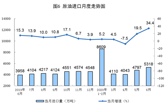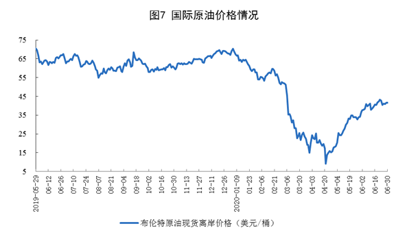 原油進(jìn)口快速增長(zhǎng),國(guó)際原油價(jià)格大幅回升。6月份,進(jìn)口原油5318萬(wàn)噸,同比增長(zhǎng)34.4%。上半年,進(jìn)口原油2.69億噸,同比增長(zhǎng)9.9%,比一季度加快4.9個(gè)百分點(diǎn)。6月30日布倫特原油現(xiàn)貨離岸價(jià)格為41.64美元/桶,比5月29日的34.15美元/桶回升21.9%。