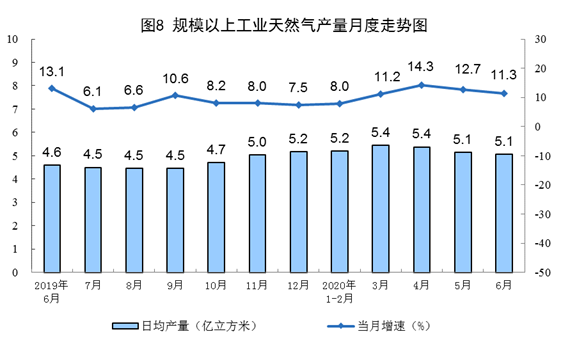 天然氣生產(chǎn)保持較快增長(zhǎng)。6月份,生產(chǎn)天然氣152億立方米,同比增長(zhǎng)11.3%,增速比上月回落1.4個(gè)百分點(diǎn),日均產(chǎn)量5.1億立方米。上半年,生產(chǎn)天然氣940億立方米,同比增長(zhǎng)10.3%,比一季度加快1.2個(gè)百分點(diǎn)。