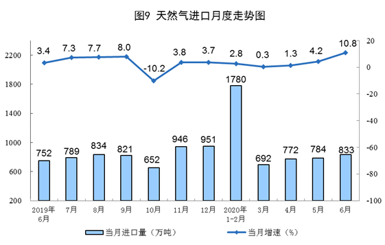 天然氣進(jìn)口增長(zhǎng)明顯加快。6月份,進(jìn)口天然氣833萬(wàn)噸,同比增長(zhǎng)10.8%,增速比上月加快6.6個(gè)百分點(diǎn)。上半年,進(jìn)口天然氣4836萬(wàn)噸,同比增長(zhǎng)3.3%,比一季度加快1.5個(gè)百分點(diǎn)。