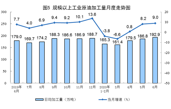 原油生產(chǎn)略有增長(zhǎng),加工量有所加快。6月份,生產(chǎn)原油1624萬(wàn)噸,同比增長(zhǎng)0.7%,增速比上月回落0.6個(gè)百分點(diǎn);加工原油5787萬(wàn)噸,增長(zhǎng)9.0%,比上月加快0.8個(gè)百分點(diǎn)。上半年,生產(chǎn)原油9715萬(wàn)噸,同比增長(zhǎng)1.7%,比一季度放緩0.7個(gè)百分點(diǎn);加工原油3.2億噸,同比增長(zhǎng)0.6%,一季度為下降4.6%。