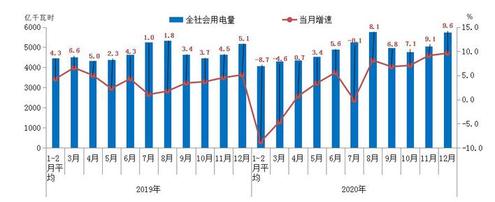 2020年四個季度我國國內(nèi)生產(chǎn)總值增速分別為-6.8%、3.2%、4.9%、6.5%,二季度起增速逐季回升。2020年,國家電網(wǎng)經(jīng)營區(qū)全社會用電量58337億千瓦時,比上年增長2.5%。其中,一季度受新冠肺炎疫情影響用電量同比下降7.4%,第二、第三、第四季度用電量增速分別為3.3%、4.9%、8.7%,呈現(xiàn)穩(wěn)步回升態(tài)勢,與各季度經(jīng)濟(jì)增速走勢一致,四季度恢復(fù)態(tài)勢強(qiáng)勁。12月份,國家電網(wǎng)經(jīng)營區(qū)全社會用電量5754億千瓦時,同比增長9.6%,增速創(chuàng)年內(nèi)新高,較上年同期上升4.5個百分點(diǎn),主要受工業(yè)生產(chǎn)加快、低溫寒潮天氣等因素影響。
