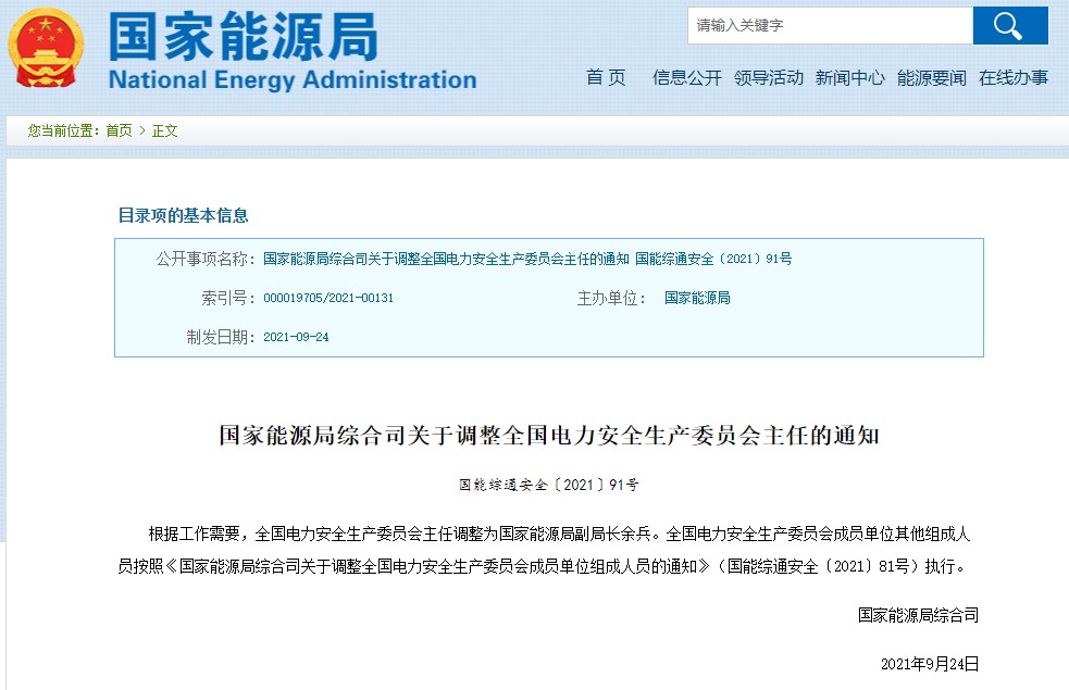 國家能源局綜合司關(guān)于調(diào)整全國電力安全生產(chǎn)委員會主任的通知