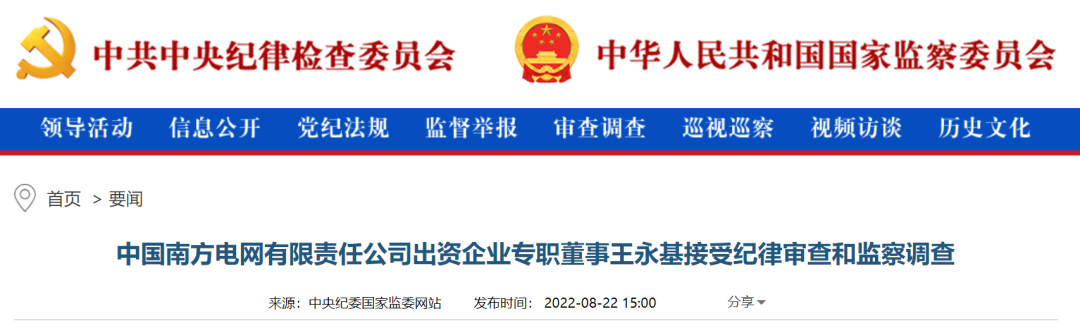 中紀委網(wǎng)站8月22日消息,中國南方電網(wǎng)有限責任公司出資企業(yè)專職董事王永基涉嫌嚴重違紀違法,目前正接受中國南方電網(wǎng)有限責任公司紀檢監(jiān)察組紀律審查和廣東省肇慶市監(jiān)察委員會監(jiān)察調(diào)查。