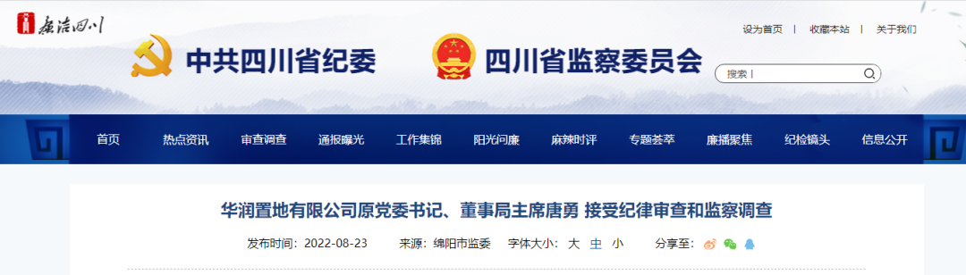 華潤置地有限公司原黨委書記、董事局主席、首席執(zhí)行官唐勇涉嫌嚴(yán)重違紀(jì)違法,目前華潤集團(tuán)紀(jì)委正對其進(jìn)行紀(jì)律審查,經(jīng)國家監(jiān)委指定四川省監(jiān)委管轄,四川省監(jiān)委指定綿陽市監(jiān)委管轄,綿陽市監(jiān)委正對其進(jìn)行監(jiān)察調(diào)查。