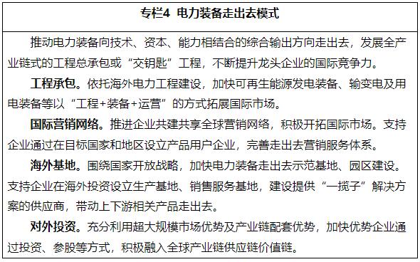 16.推動(dòng)電力裝備走出去。緊緊圍繞高質(zhì)量共建“一帶一路”、深入實(shí)施《區(qū)域全面經(jīng)濟(jì)伙伴關(guān)系協(xié)定》,鼓勵(lì)優(yōu)勢(shì)電力裝備企業(yè)以多種方式加快走出去。引導(dǎo)企業(yè)取得國(guó)際認(rèn)可的服務(wù)資質(zhì),帶動(dòng)技術(shù)、裝備、標(biāo)準(zhǔn)和服務(wù)走出去。支持行業(yè)組織搭建走出去信息綜合服務(wù)平臺(tái),提供法律、咨詢(xún)、風(fēng)險(xiǎn)評(píng)估等服務(wù)。