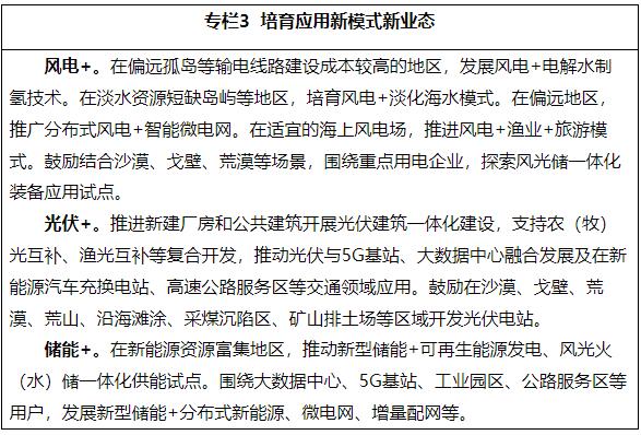 15.培育推廣應(yīng)用新模式新業(yè)態(tài)。推進(jìn)源網(wǎng)荷儲(chǔ)一體化和多能互補(bǔ),培育風(fēng)電+、光伏+等多種應(yīng)用新模式新業(yè)態(tài),加快多層級(jí)多時(shí)間尺度多能互補(bǔ)協(xié)同優(yōu)化。