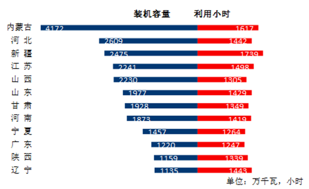 圖3 1-8月份風電裝機較多省份風電裝機容量和設備利用小時