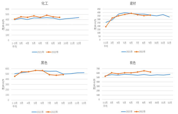 1-9月,化工行業(yè)用電量4065億千瓦時,同比增長5.1%;建材行業(yè)用電量2960億千瓦時,同比下降4.2%;黑色金屬冶煉行業(yè)用電量4583億千瓦時,同比下降5.3%;有色金屬冶煉行業(yè)用電量5556億千瓦時,同比增長3.0%。