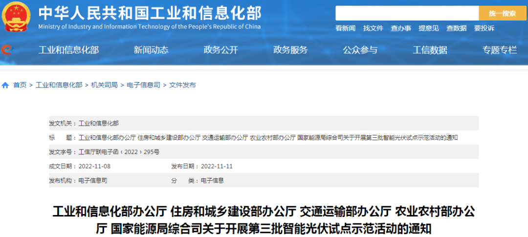 為進(jìn)一步促進(jìn)光伏產(chǎn)業(yè)與新一代信息技術(shù)深度融合,推動(dòng)智能光伏技術(shù)進(jìn)步和行業(yè)應(yīng)用,根據(jù)《智能光伏產(chǎn)業(yè)創(chuàng)新發(fā)展行動(dòng)計(jì)劃(2021—2025年)》(工信部聯(lián)電子〔2021〕226號)工作部署,工業(yè)和信息化部、住房和城鄉(xiāng)建設(shè)部、交通運(yùn)輸部、農(nóng)業(yè)農(nóng)村部、國家能源局決定組織開展第三批智能光伏試點(diǎn)示范活動(dòng)。有關(guān)事項(xiàng)通知如下: