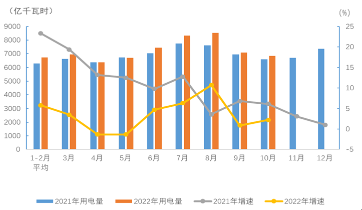 圖1 2021、2022年分月全社會用電量及其增速