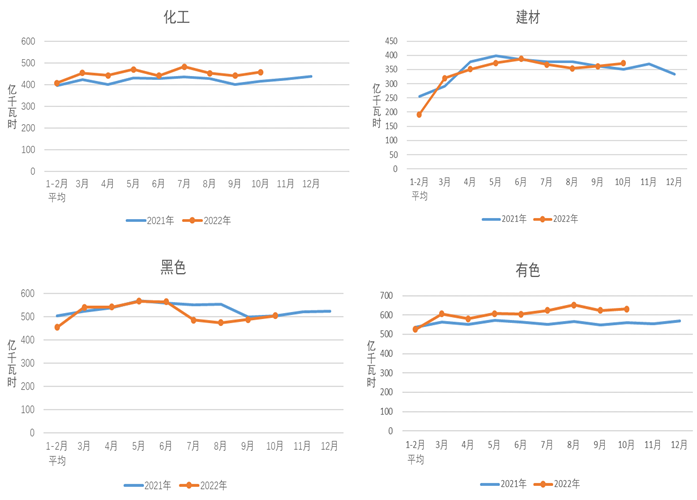 1-10月,化工行業(yè)用電量4523億千瓦時(shí),同比增長5.3%;建材行業(yè)用電量3332億千瓦時(shí),同比下降3.2%;黑色金屬冶煉行業(yè)用電量5087億千瓦時(shí),同比下降4.9%;有色金屬冶煉行業(yè)用電量6182億千瓦時(shí),同比增長2.9%。