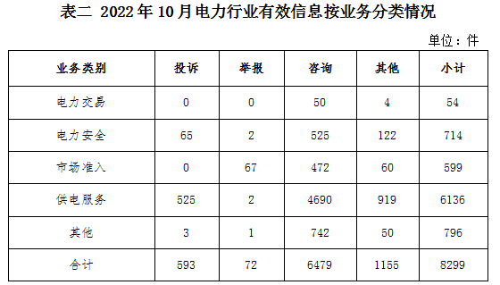 電力行業(yè)排在首位,有效信息數(shù)量為8299件,占全部有效信息的62.69%。群眾關(guān)注的內(nèi)容主要集中在供電服務(wù)、電力安全、市場準入等方面。(2022年10月電力行業(yè)有效信息按業(yè)務(wù)分類情況見表二)